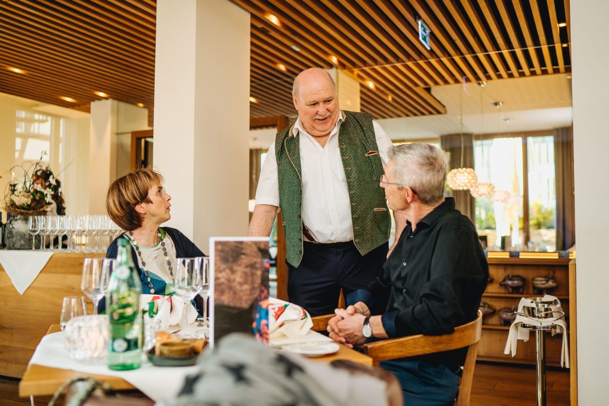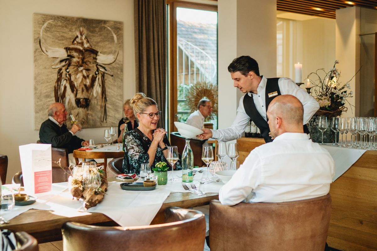Die mediterrane Genusssprache ist ohnehin ihre liebste. Tagtäglich begeistern Küchenchef Markus Merk, Sous Chef Felix Bau und Team unsere Hotelgäste in der Untersee Stube mit südlich-inspirierten Speisen. Zusammen mit Corinna Blondzik-Burgo arrangierten sie für den Feinkostabend am Bodensee eine kulinarische Reise durch Italien in fünf Gängen. Ihre Zutaten: Weine und Produkte des Feinkostladens in Hemmenhofen. Den Anfang machten Cincetti mit Steinpilz-Pate und mariniertem Kräuter-Saitling sowie gegrillte Paprika mit mariniertem Sardellenfilet und Meeresfenchel. Weiter ging es mit einem erfrischenden Gang aus Burrata auf Mangowürfel in Mango-Essig und Limonen-Öl. Danach servierte das Team einen liebgewonnenen Klassiker unserer BIG BOTTLE PARTY: Spaghetti al tartufo aus dem Parmesanleib. Fisch und Fleisch erfüllten die Hauptgangfolgen. Zander gebraten auf Melanzane sowie Brasato geschmort vom Weiderind mit Gemüse-Garnitur und Polenta genossen die Feinschmeckenden unseres Genuss-Events am Bodensee. Den süßen Abschuss des Menüs krönte ein Orangen-Tiramisu mit in Arancello marinierten Löffelbiskuits. Corinna und unser Service-Team begleiteten jeden Gang mit ausgewählten Weinen, die die Eigenschaften der Speisen nochmal besonders harmonisch untermalten.